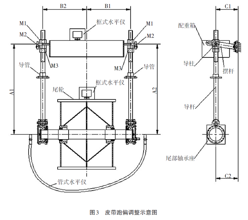 (3)鋼絲膠帶斗式提升機試運行時膠帶跑偏的調整。松開兩邊M1螺母,觀察膠帶跑偏方向,向左跑偏緊左M2螺母,向右跑偏則緊右M2螺母(理論值│A1-A2│≤0.5、│B1-B2│≤0.5、│C1-C2│≤0.5),達到理想要求后,緊固兩邊M1、M2、M3螺母。調整完成后,尾輪組件應能在擺桿范圍內上下活動自如,尾輪轉動靈活,無卡阻、刮磨現象。擺桿滑槽與導柱滑動可靠,導管導柱全程可靠。在調試過程中,經常碰到糾偏無效的情況,要冷靜分析、仔細查找原因。首先重點檢查尾部軸承座兩側滑槽與箱體滑軌之間的間隙是否滿足要求,如有卡阻,應松開滑軌固定螺栓進行調整,滿足要求后緊固螺栓,保證尾部軸承座上下滑動自如,無卡阻現象;其次檢查擺桿內側與導柱端面的間隙,不能貼緊,要保持0.5mm的間隙;再次檢查配重箱是否在現場加滿碎鐵塊后再注入混凝土,如未加滿碎鐵塊,配重箱重量不夠,將無法張緊膠帶,造成糾偏無效。
