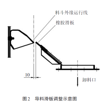 為控制物料回流,在提升機頭部出料口設置了一個可調節的橡膠滑板,在料斗安裝完后,調整橡膠滑板外緣使它與料斗外緣運行線之間的距離為10mm,將其緊固(見圖2)。
