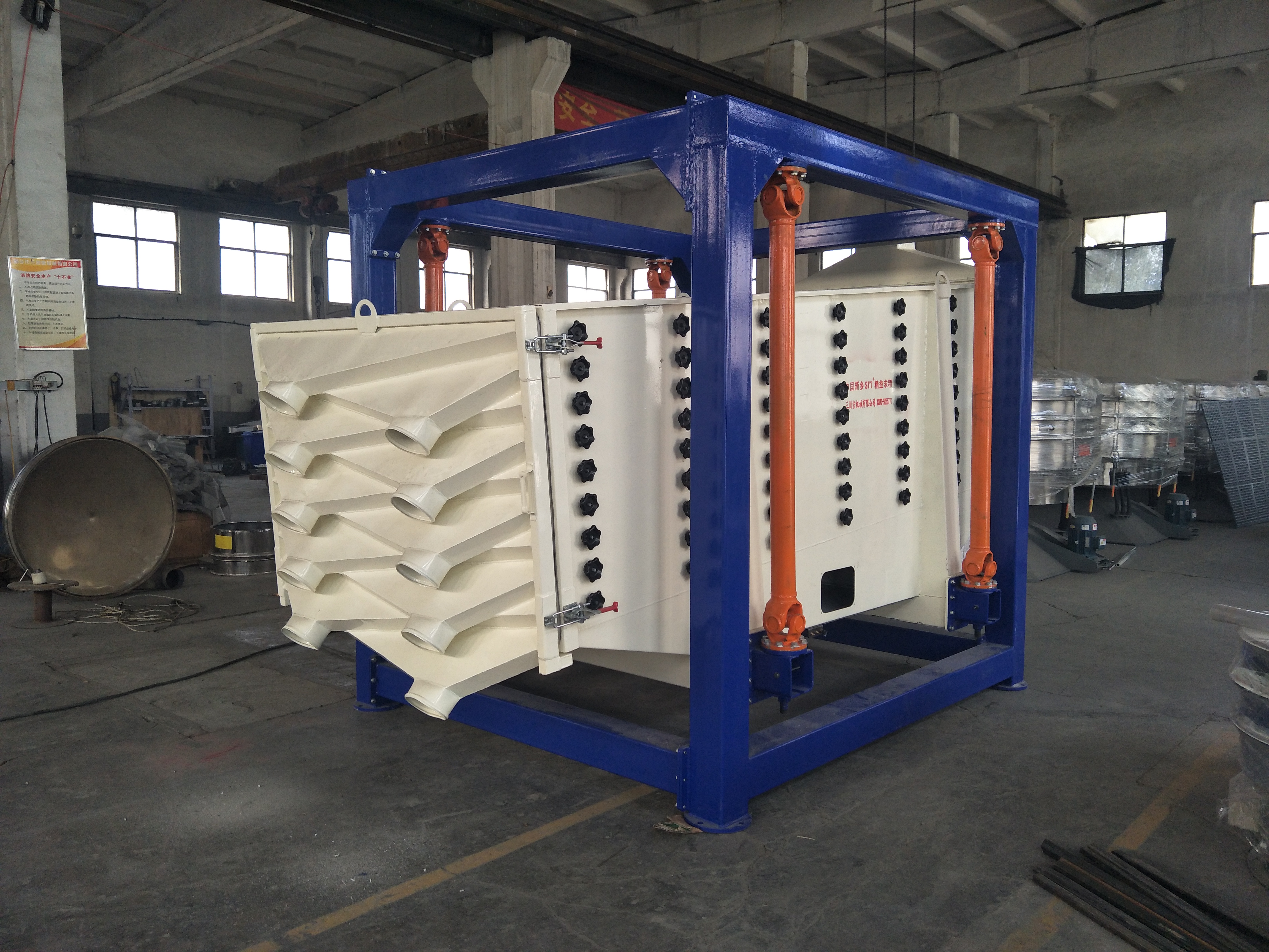 方形箱式搖擺篩結構圖 (平面搖擺篩與方形搖擺篩) 搖擺篩被眾多用戶所熟知,其篩分設備因為產量大,篩分精度高,使用壽命長等特點,在各行業應用廣泛,比較擅長篩分中細精度的物料,常見篩分70目-180目的粉末或者顆粒類物料。方形箱式搖擺篩更能滿足用戶的篩分產量要求,下面來說明一下方形箱式搖擺篩的結構。方形箱式搖擺篩由篩箱、篩框、篩網、清網裝置、支撐框架、驅動電機、傳動皮帶、激振器、搖擺臂(萬向軸)、進出料口、吊耳、觀察口等結構組成,其篩分動作類似人工篩分動作,可以在篩分過程中保留物料的物理性狀,而