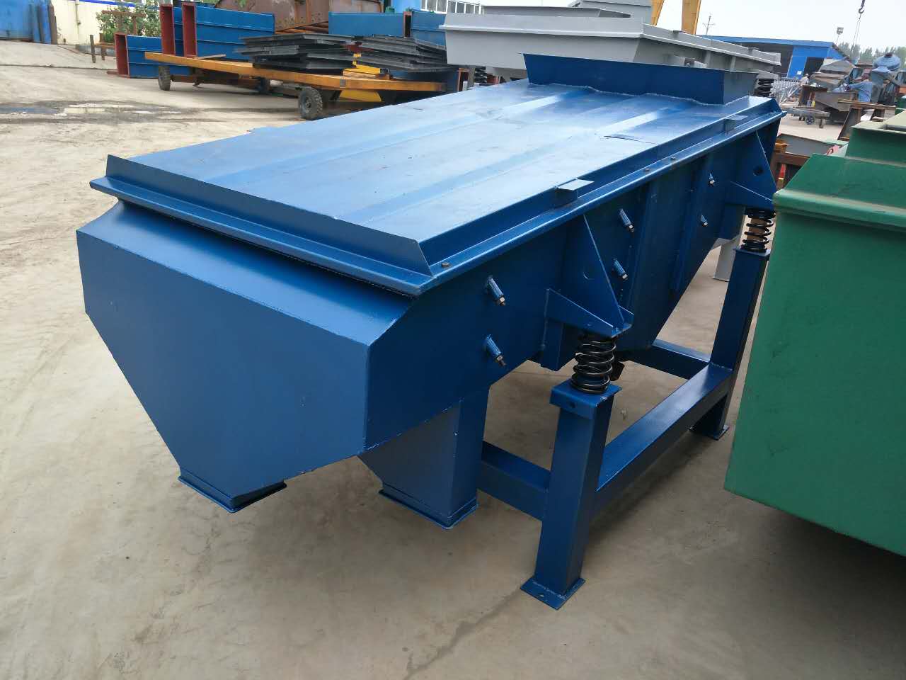 了解直線振動篩結構(直線振動篩的原理) 該篩機主要由篩箱、篩框、篩網、振動電機、電機臺座、減振彈簧、支架等組成。 1、篩箱:由數種厚度不同的鋼板焊制而成,具有一定的強度和剛度,是篩機的主要組成部分。 2、篩框:由松木或變形量較小的木材制成,主要用來保持篩網平整,達到正常篩分。 3、篩網:有低碳鋼、黃銅、青銅、不銹鋼絲等數種篩網。就我公司來說,現在直線振動篩一般都是用的不銹鋼篩網為304材質。 4、振動電機(使用與維修方法詳見振動電機使用說明書)。 5、電機臺座:安裝振動電機,使用前連接螺釘必